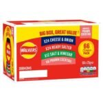 Elevate your snacking experience with the Giant Crisps Multipack Snack Box, featuring 66 individual 25g packs of assorted classic Walkers crisps: 24 x cheese and onion crisps, 24 x ready salted crisps, 12 x salt and vinegar & 6 x prawn cocktail crisps sharing bags.