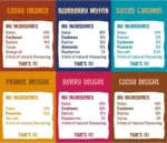 Primary Material Subtype ‎Cocoa Orange Ingredients: Dates 40%, CASHEWS 40%, Raisins 14%, Cocoa 5%, Orange oil, Natural flavouring. Blueberry Muffin Ingredients: Dates 58%, CASHEWS 15%, Raisins 15%, ALMONDS 10%, Blueberries 2, Natural flavouring. Salted Caramel Ingredients: Dates 54%, Raisins 21%, CASHEWS 12%, PEANUTS 12%, sea salt 0,4%, Natural flavouring. Peanut Delight Ingredients: Dates 53%, PEANUTS 46%, Sea salt, Natural flavouring. Berry Delight Ingredients: Dates 49%, CASHEWS 30%, Raisins 17%, Raspberries 3%, Natural flavouring. Cocoa Delight Ingredients: Dates 48%,CASHEWS 30%, Raisins 16%, Cocoa 6%, Natural flavouring.