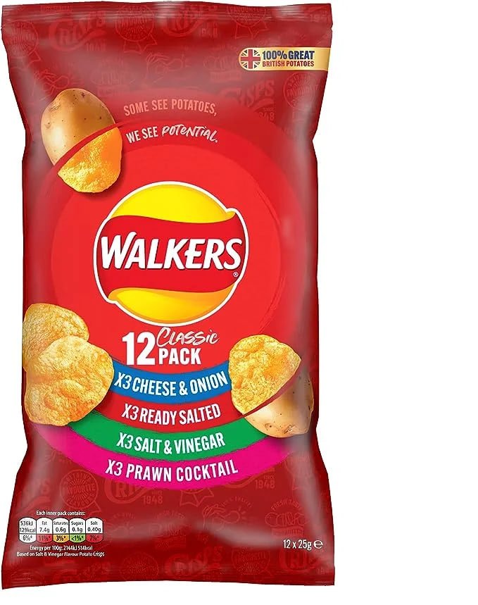 Bulk-buy Walkers Crisps by the case to keep your family satisfied. Each case contains 60 packs and includes flavours: Cheese & Onion, Salt & Vinegar, Ready Salted and Prawn Cocktail