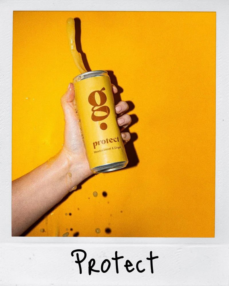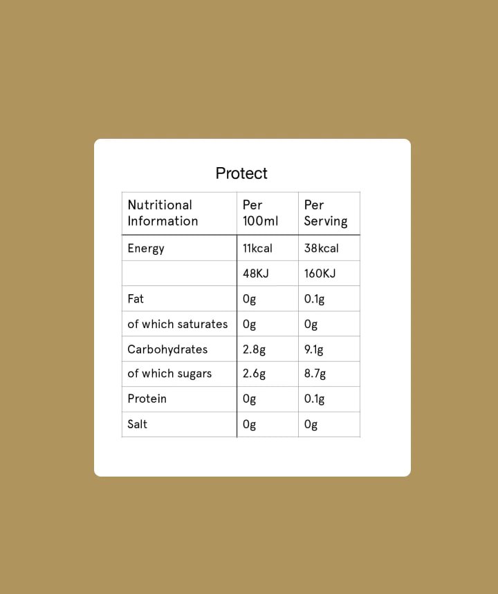 Protect is a warming and zesty mix of lemon, ginger, turmeric, and meadowsweet creating a comforting yet refreshing and invigorating taste profile. The subtle hint of peppercorn and the addition of chaga add to its unique flavour, making this drink a truly distinctive experience.