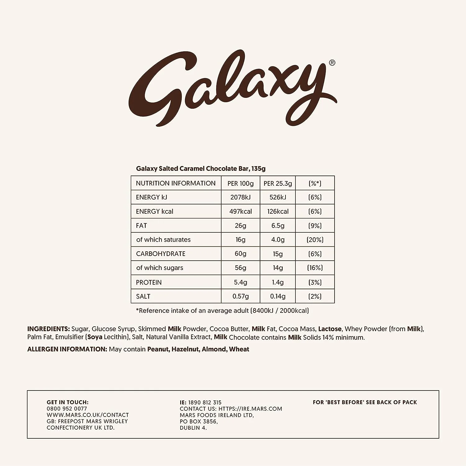 Package Dimensions 16.5 x 8.3 x 1.4 cm; 135 Grams Item model number 107206130 Allergen Information Contains: Milk, Soy, Cereals containing Gluten, Wheat, Hazelnuts, Almonds, Peanuts Weight 135 Grams Units 135.0 gram Manufacturer contact GB: Freepost Mars. IRL: Mars Ireland, Box 3856, Dublin 4. Country of origin United Kingdom Brand Galaxy Format Bar Speciality Kosher Suitable for Vegetarians Package Information Pouches Manufacturer Galaxy